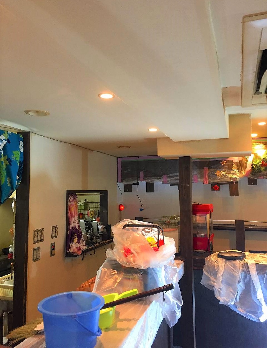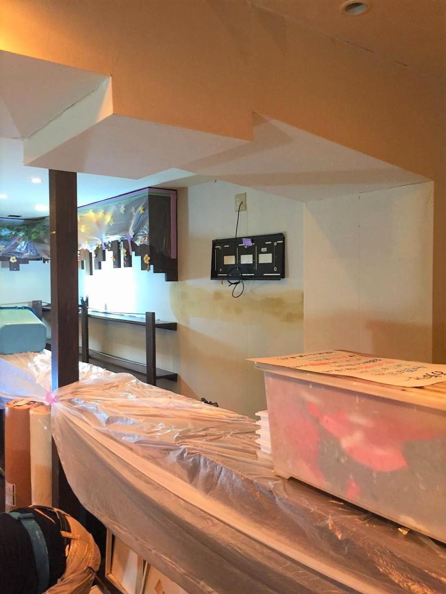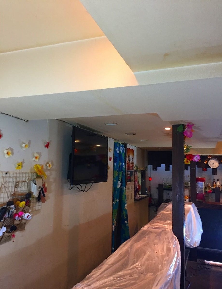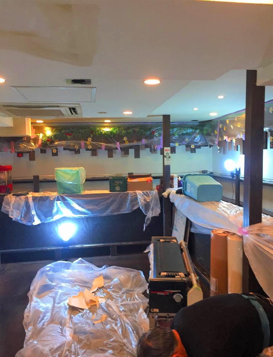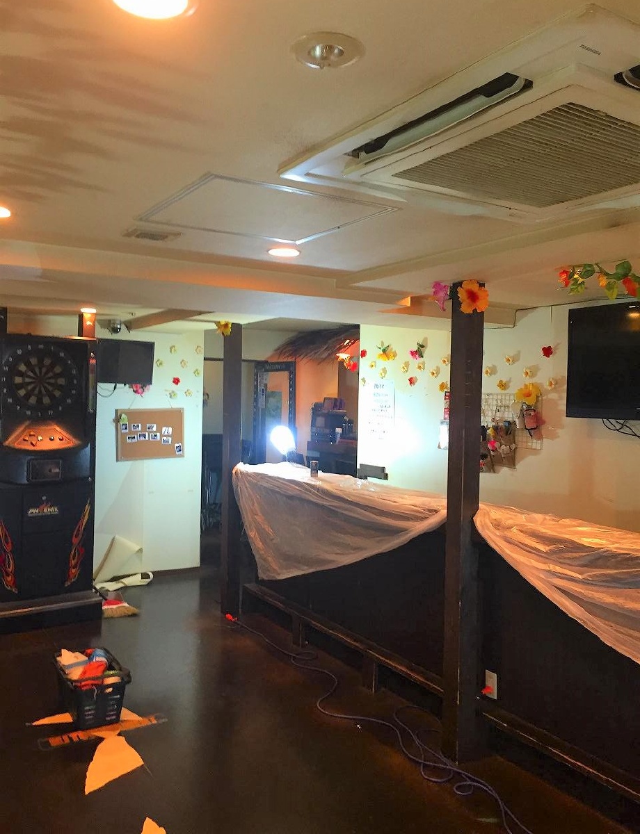 店舗内装改修工事をさせて頂きました。天井・梁・壁クロス張替・床塩ビタイル貼施工。