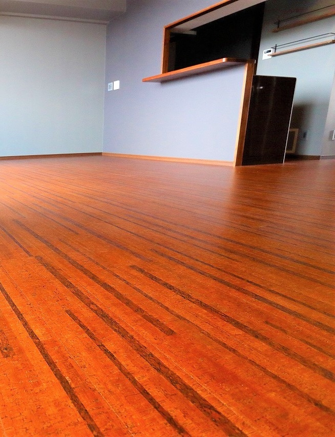 「大和屋コルクフローリング」は、居室だけでなくキッチンなどの水回り、床暖房にも使えるコルク床材。表面にスーパーセラミック塗装をほどこしてあるため、キズにもつよい。